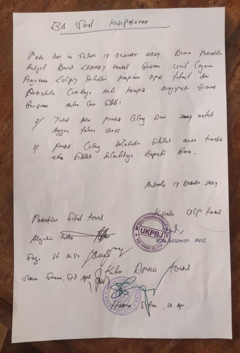 Kesepakatan tersebut tertuang dalam Berita acara yang telah di tanda tangani Oleh ketua DPRD Kepala ULP Konsel dan Perwakilan Serikat Anti Koruspi