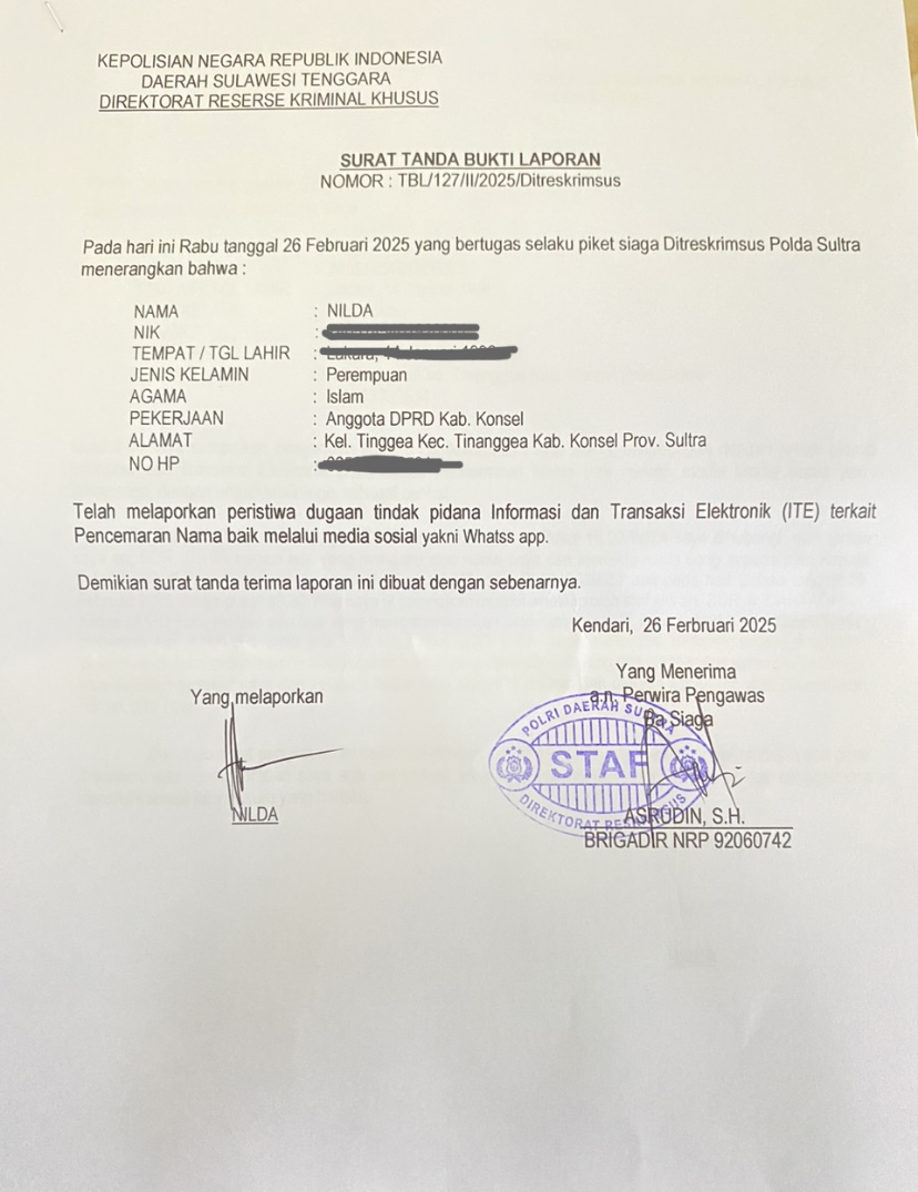 Laporan Nilda telah diterima oleh Polda sultra Nomor Laporan : TBL/127/II/2025/Distreskrimsus tanggal 26 Februsari 2025.