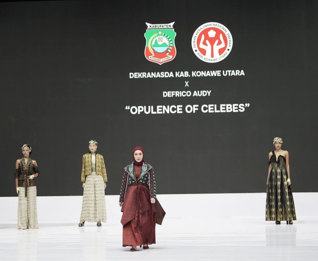 Busana tersebut merupakan hasil kolaborasi antara Dekranasda Konawe Utara dengan desainer nasional Defrico Audy.