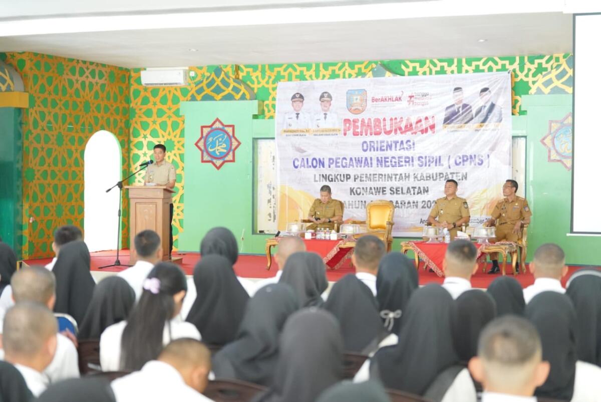 Konawe Selatan, Sultraupdate.id – Bupati Konawe Selatan, Irham Kalenggo, S.Sos., M.Si., secara resmi membuka Orientasi Calon Pegawai Negeri Sipil (CPNS) Tahun 2025 di Gedung Islamic Center Andoolo, Selasa (16/9/2025). Kegiatan ini diikuti oleh 163 peserta dan akan berlangsung selama dua hari, sebelum dilanjutkan dengan Pelatihan Dasar (Latsar) selama tiga bulan ke depan.