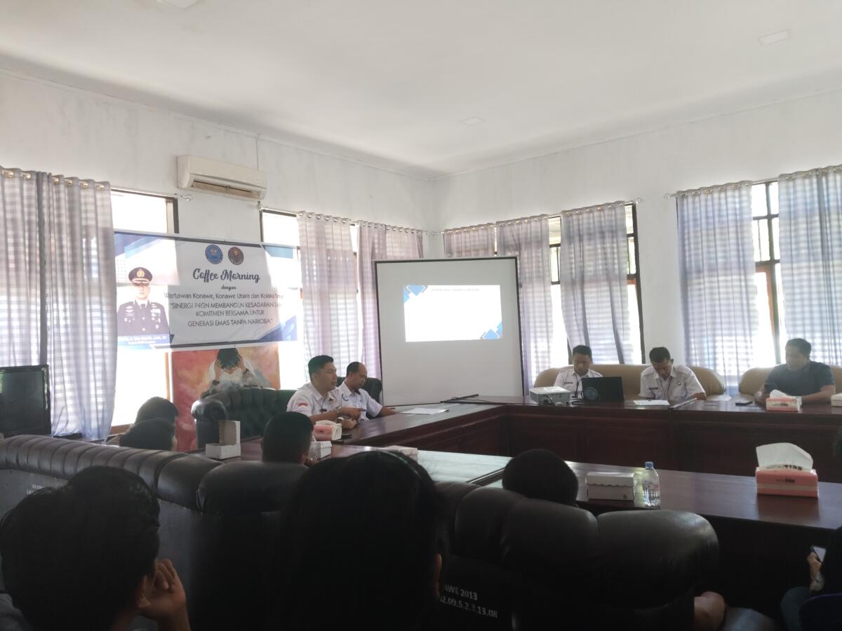 Konawe. Sultraupdate. Id- Semangat kolaborasi dalam memerangi narkoba terus digaungkan oleh Badan Narkotika Nasional (BNN) Kabupaten Konawe. Melalui kegiatan Coffee Morning P4GN, BNN mengajak insan pers dari tiga daerah Konawe, Konawe Utara, dan Kolaka Timur untuk bersinergi membangun kesadaran bersama menuju Generasi Emas Tanpa Narkoba.