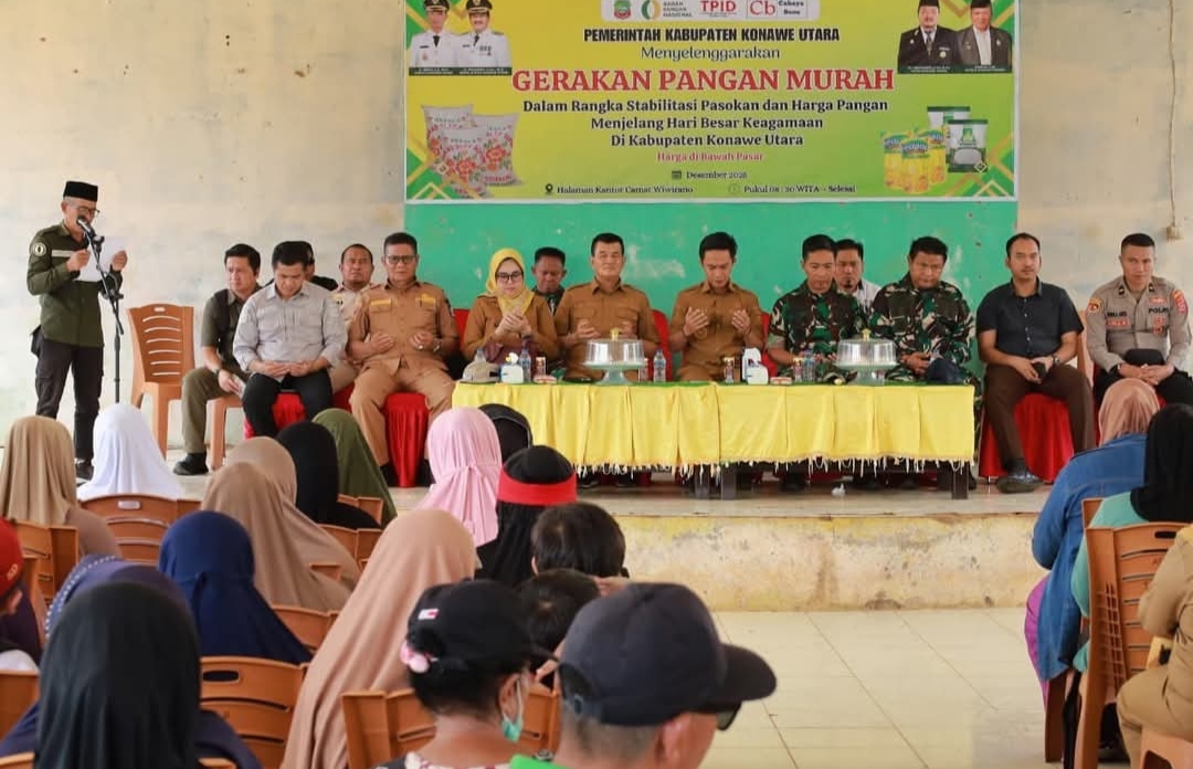 Konawe Utara. Sultraupdate. id- Menjelang perayaan Natal Tahun 2025 dan Tahun Baru 2026, Pemerintah Kabupaten Konawe Utara kembali menunjukkan komitmennya dalam menjaga stabilitas pangan dan daya beli masyarakat dengan menggelar Gerakan Pangan Murah (GPM). Kegiatan ini dipusatkan di Aula Kantor Kecamatan Wiwirano, Selasa, 16 Desember 2025.